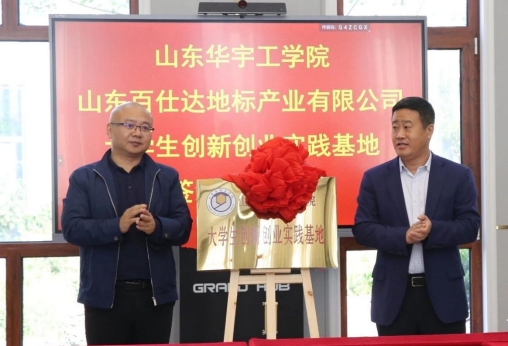 山东百仕达地标产业有限公司总经理曹成坤与我校校长助理魏东坡共同为大学生创新创业实践基地揭牌。